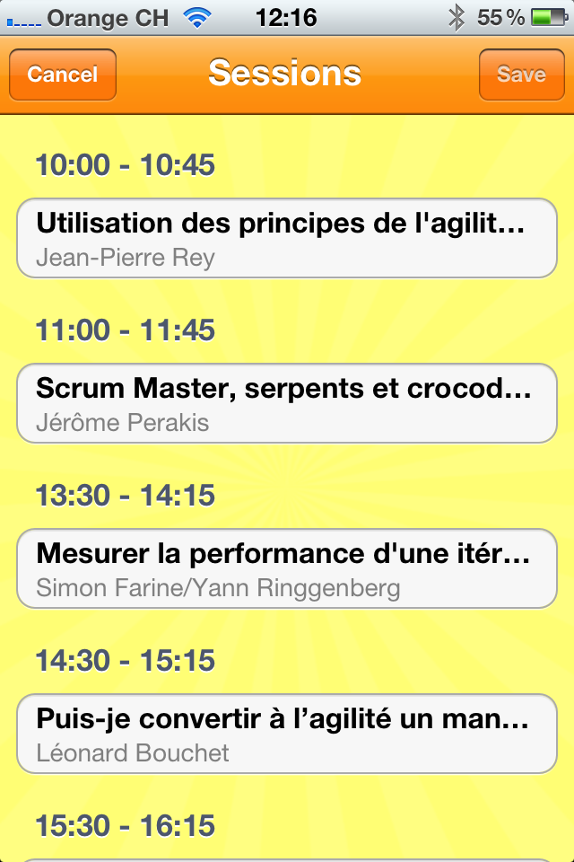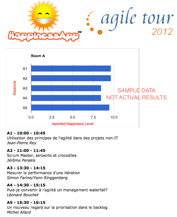 18-11-2012This Friday I will be leading a workshop on Scrum Performance at the Agile Tour in Lausanne. The HappinessApp will also be present, collecting feedback from the participants about their satisfaction with the sessions. Their feedback will be displayed in nearly real time for all the participants to see on a big projection screen during the breaks.