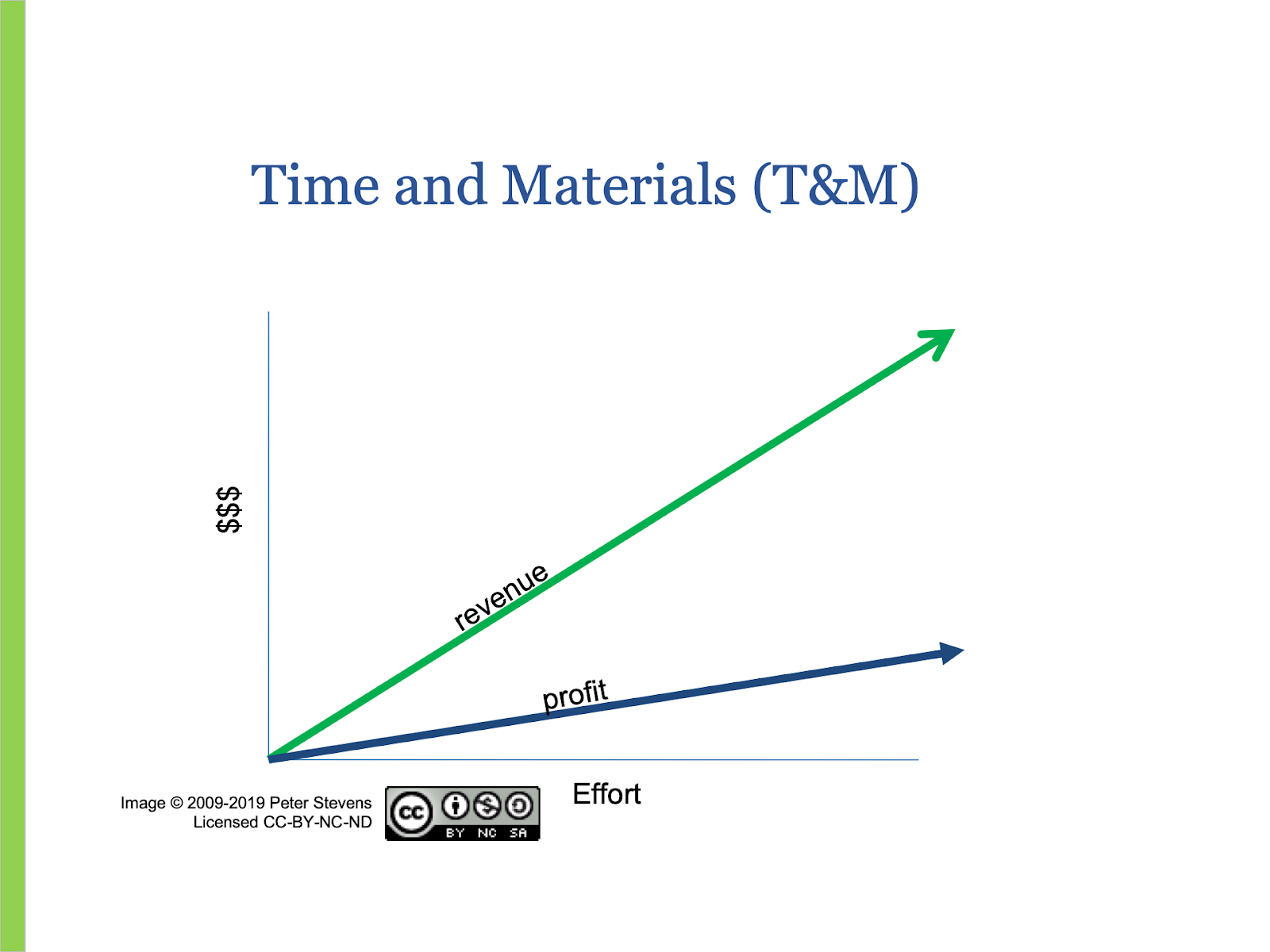 Risks: The financial and delivery risks are carried 100% by the client. Supplier has little incentive to keep costs down. Effort to ensure that only legitimate effort and expenses are invoiced can be substantial. Innovation in this context can be challenging because competitive innovations are likely to be disruptive and may lead to the end of the relationship.